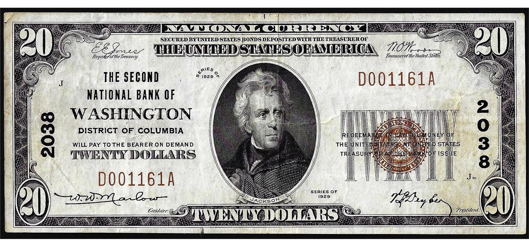 One 1929 $20 Second NB of Washington, District of Columbia CH# 2038 National Currency Note.