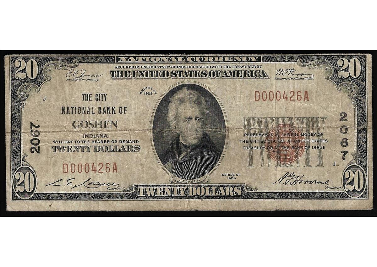 One 1929 $20 The City National Bank of Goshen Indiana National Currency Note.