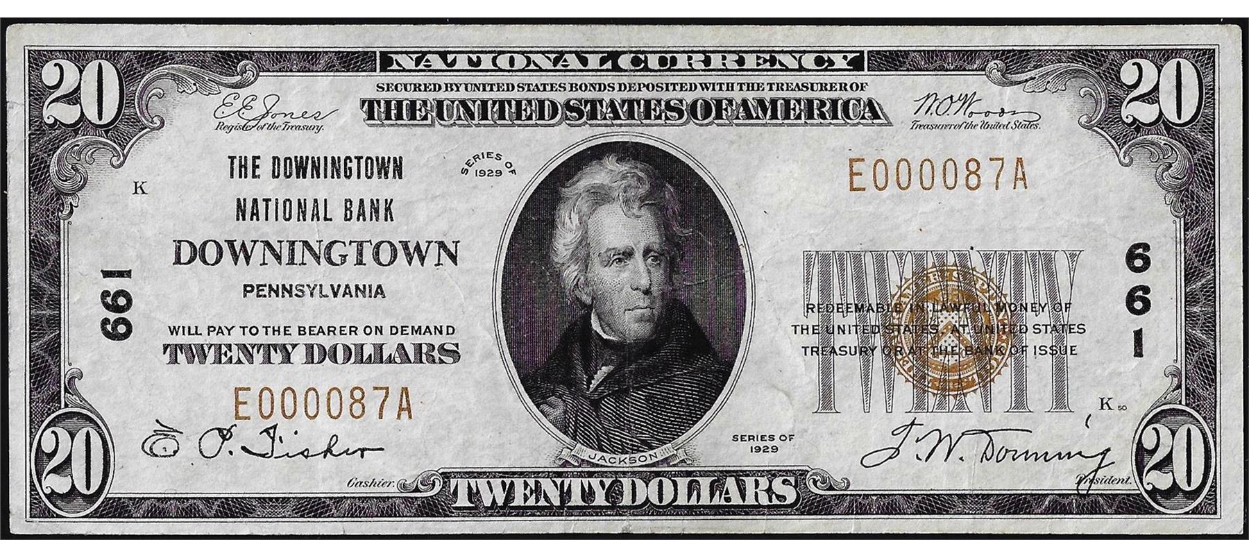 One 1929 $20 The Downington National Bank Downingtown, PA CH# 661 National Currency Note.