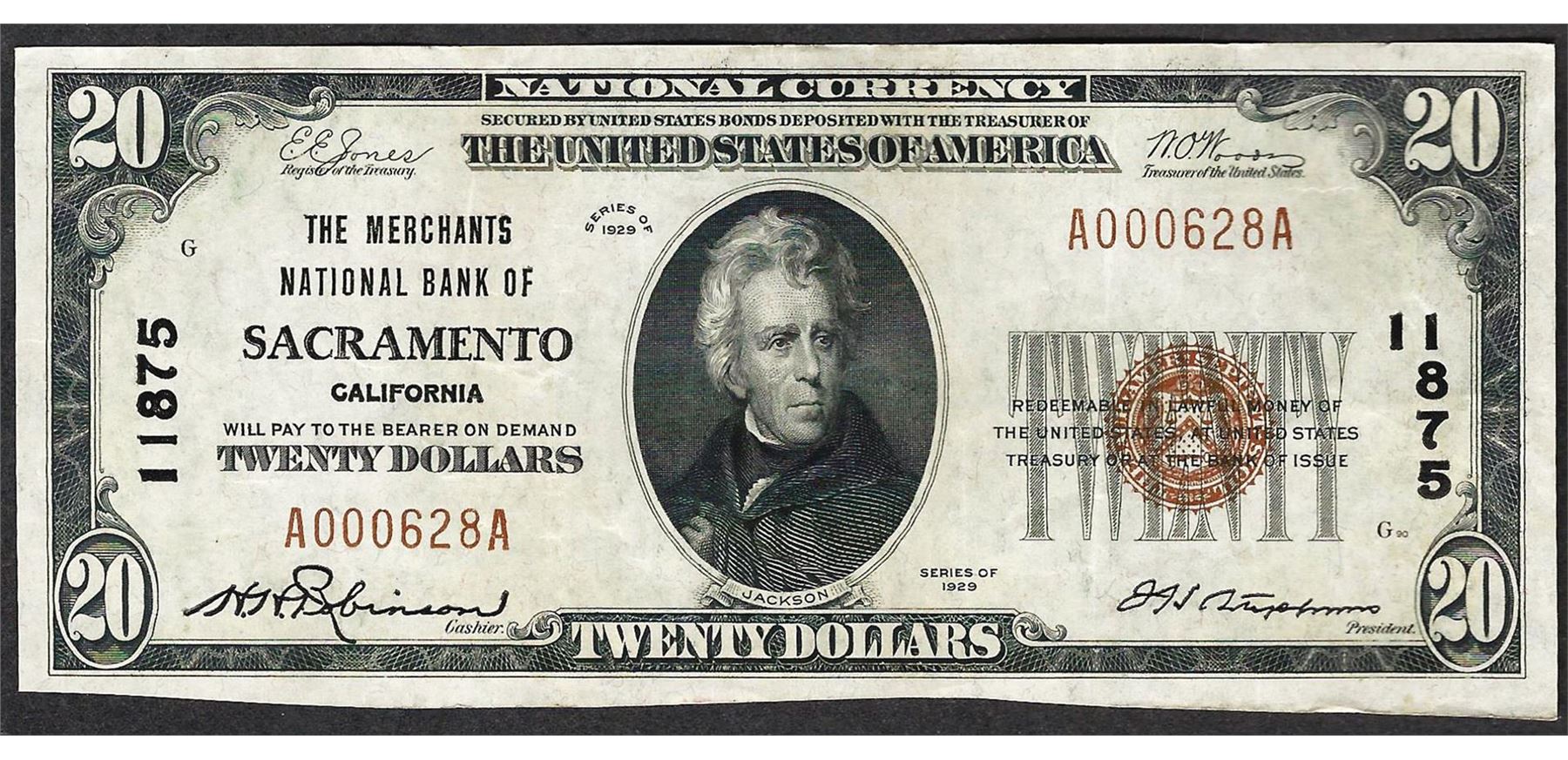 One 1929 $20 The Merchants National Bank of Sacramento Currency Note CH# 11875.