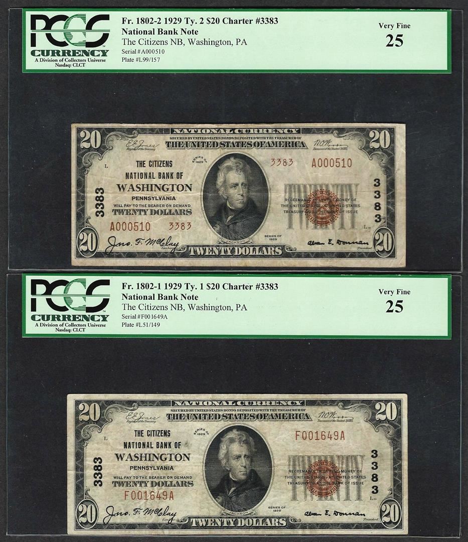 One 1929 $20 Ty.1/2 Citizens NB Washington, PA CH# 3383 National Currency Notes PCGS VF25. PCGS Graded.