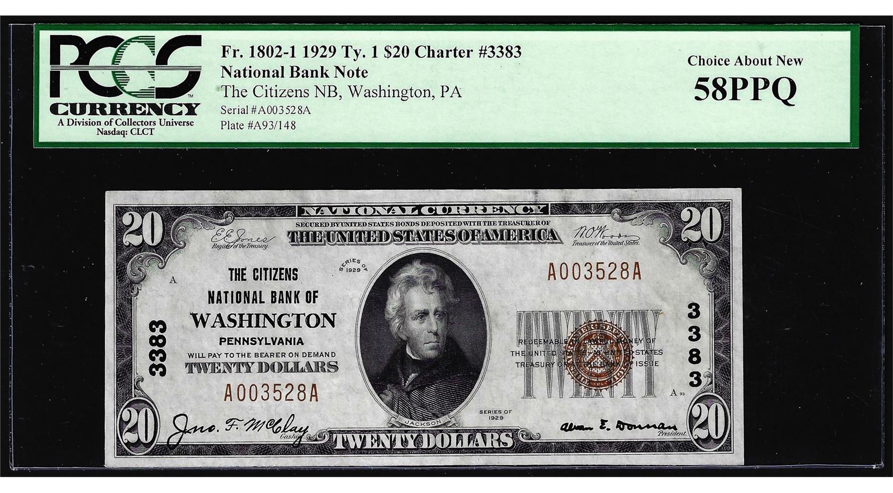 One 1929 $20 Washington, PA CH# 3383 National Currency Note PCGS Choice About New 58PPQ. PCGS Graded.