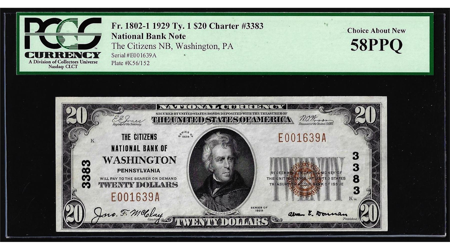 One 1929 $20 Washington, PA CH# 3383 National Currency Note PCGS Choice About New 58PPQ. PCGS Graded.