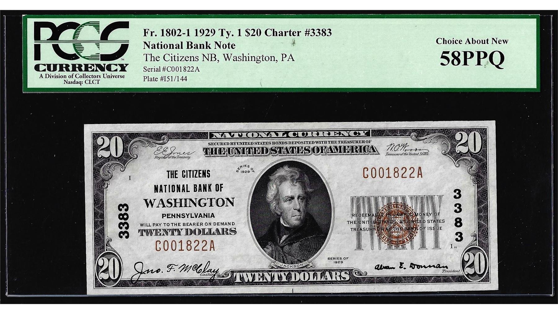 One 1929 $20 Washington, PA CH# 3383 National Currency Note PCGS Choice About New 58PPQ. PCGS Graded.