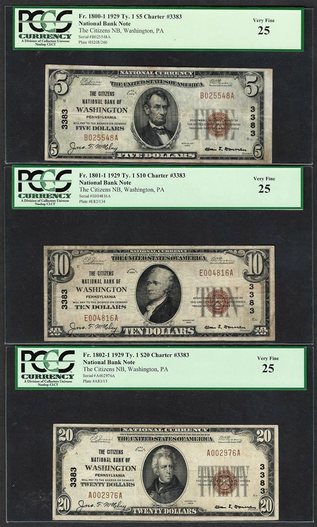 One 1929 $5/10/20 Citizens NB Washington, PA CH# 3383 National Currency Notes PCGS VF25. PCGS Graded.
