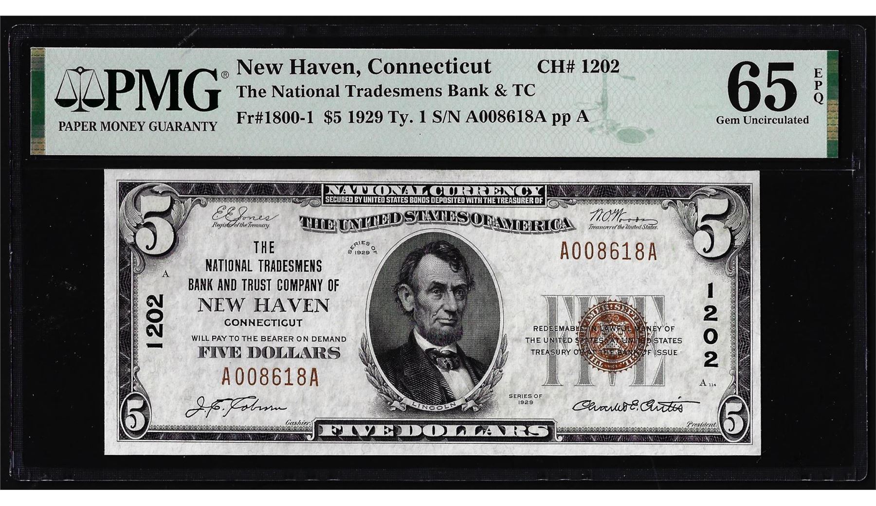 One 1929 $5 Bank & Trust New Haven, CT CH# 1202 National Note PMG Gem Uncirculated 65EPQ. PMG Certified.