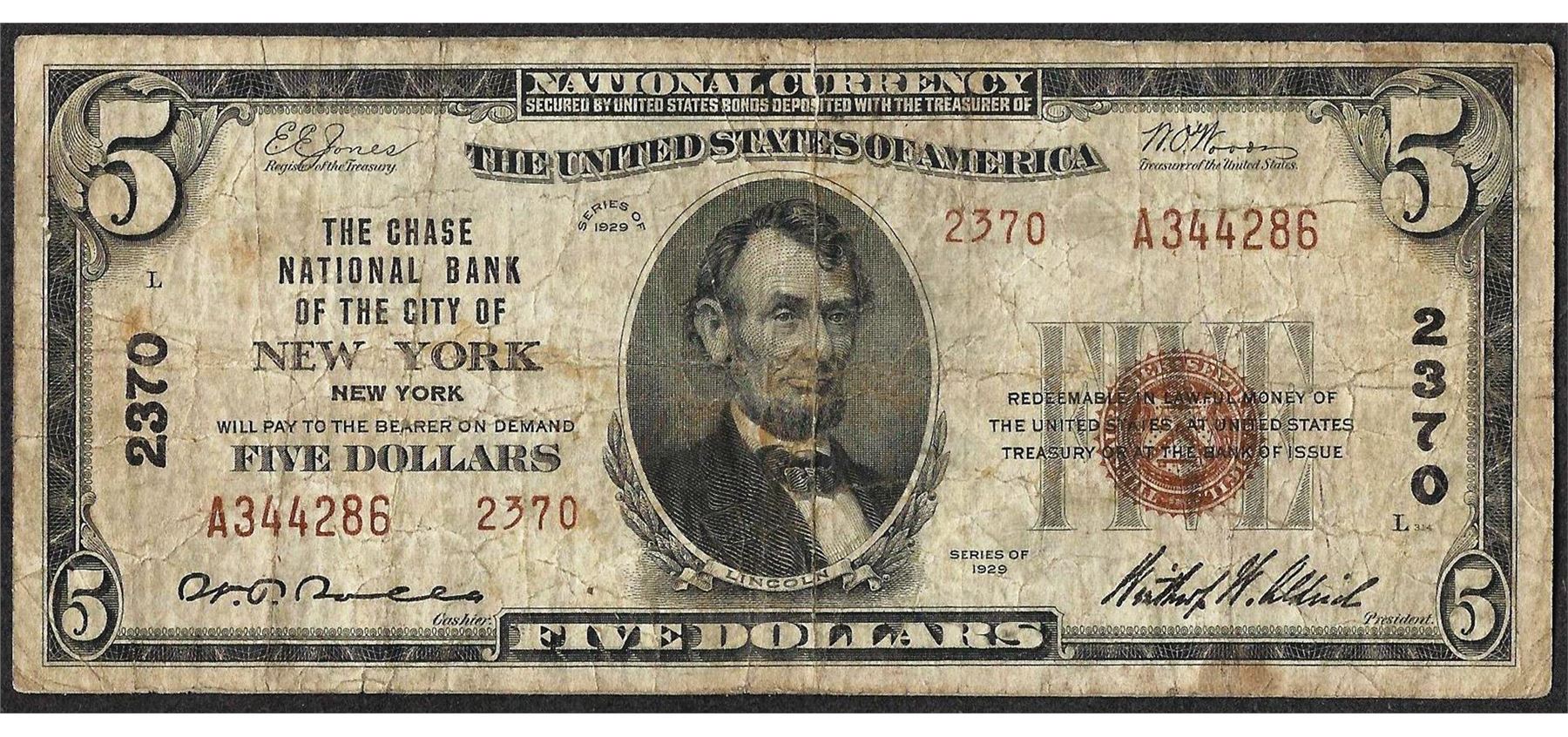 One 1929 $5 Chase NB City of New York CH#2370 National Currency Note.