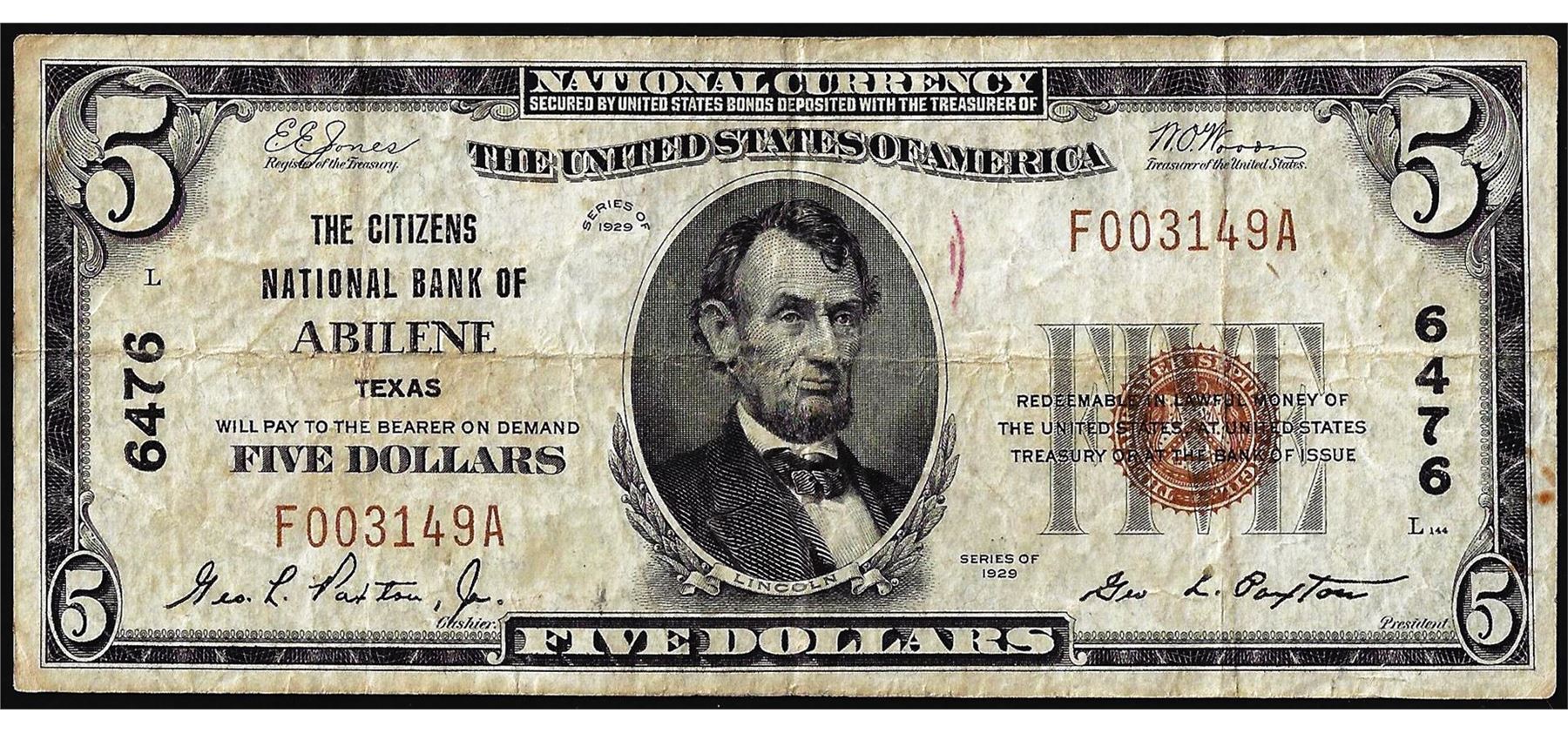 One 1929 $5 Citizens National Bank of Abilene, Texas CH# 6476 National Currency Note.