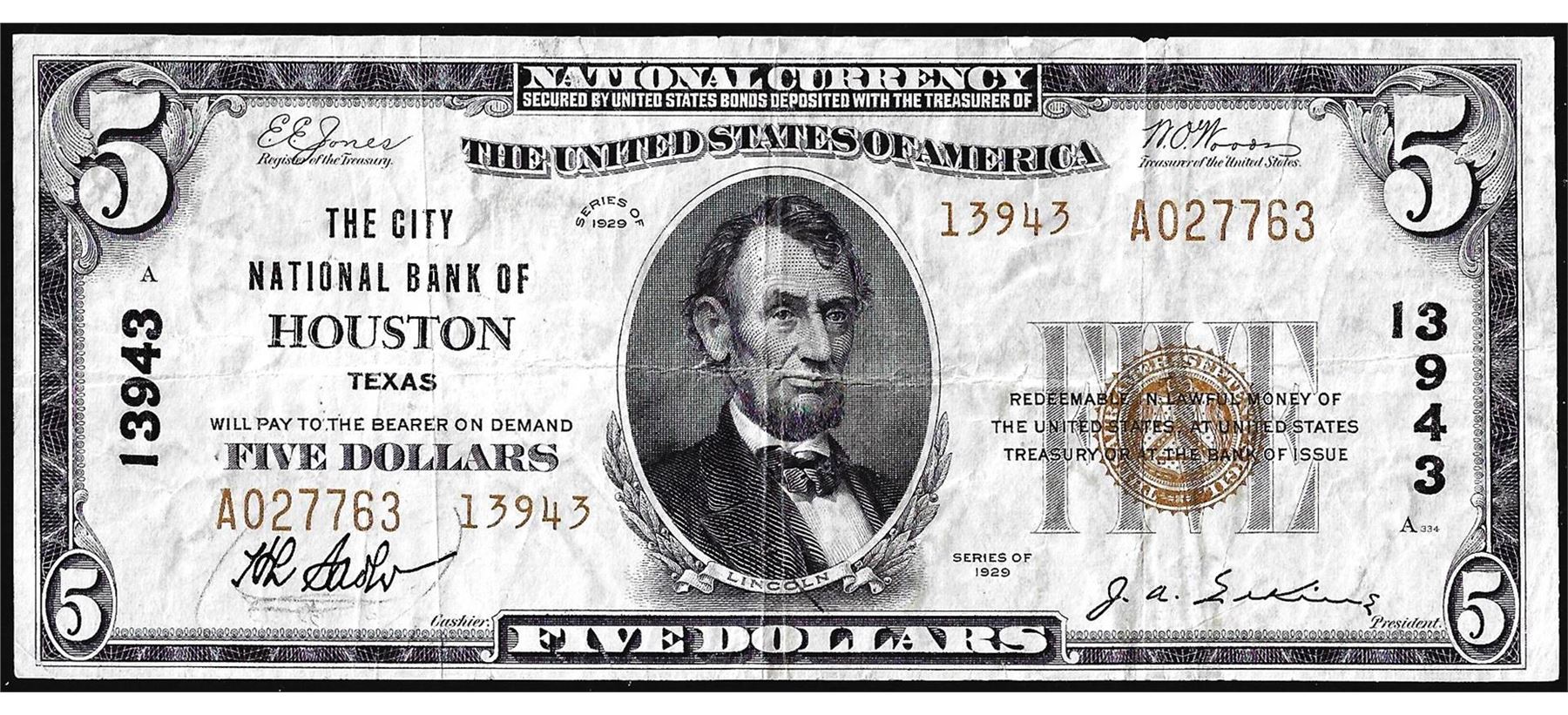 One 1929 $5 City National Bank of Houston, TX CH# 13943 National Currency Note.