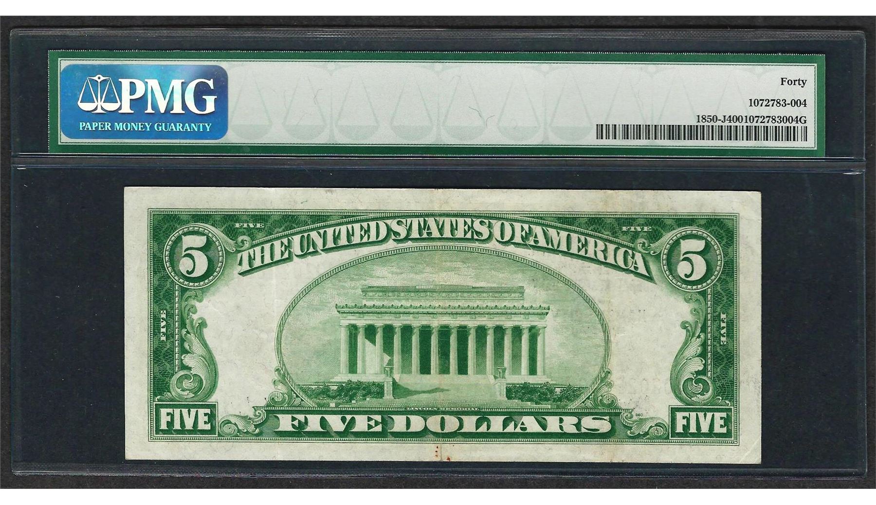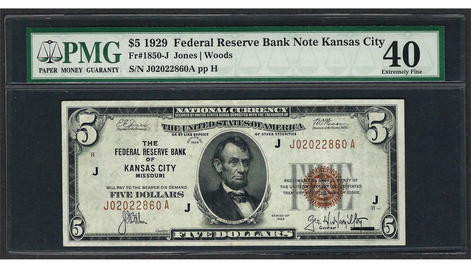 One 1929 $5 Federal Bank of Kansas City Note Fr.1850-J PMG Extremely Fine 40. PMG Certified.