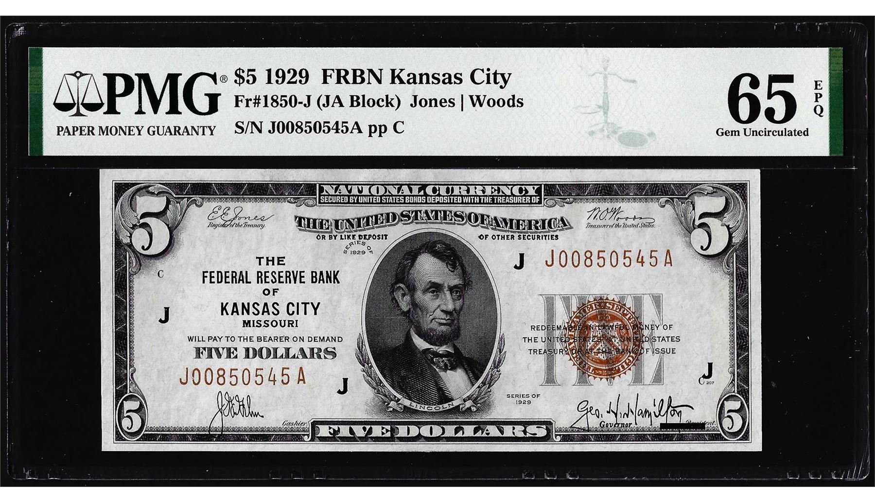 One 1929 $5 Federal Reserve Bank Note Kansas City Fr.1850-J PMG Gem Uncirculated 65EPQ. PMG Certified.