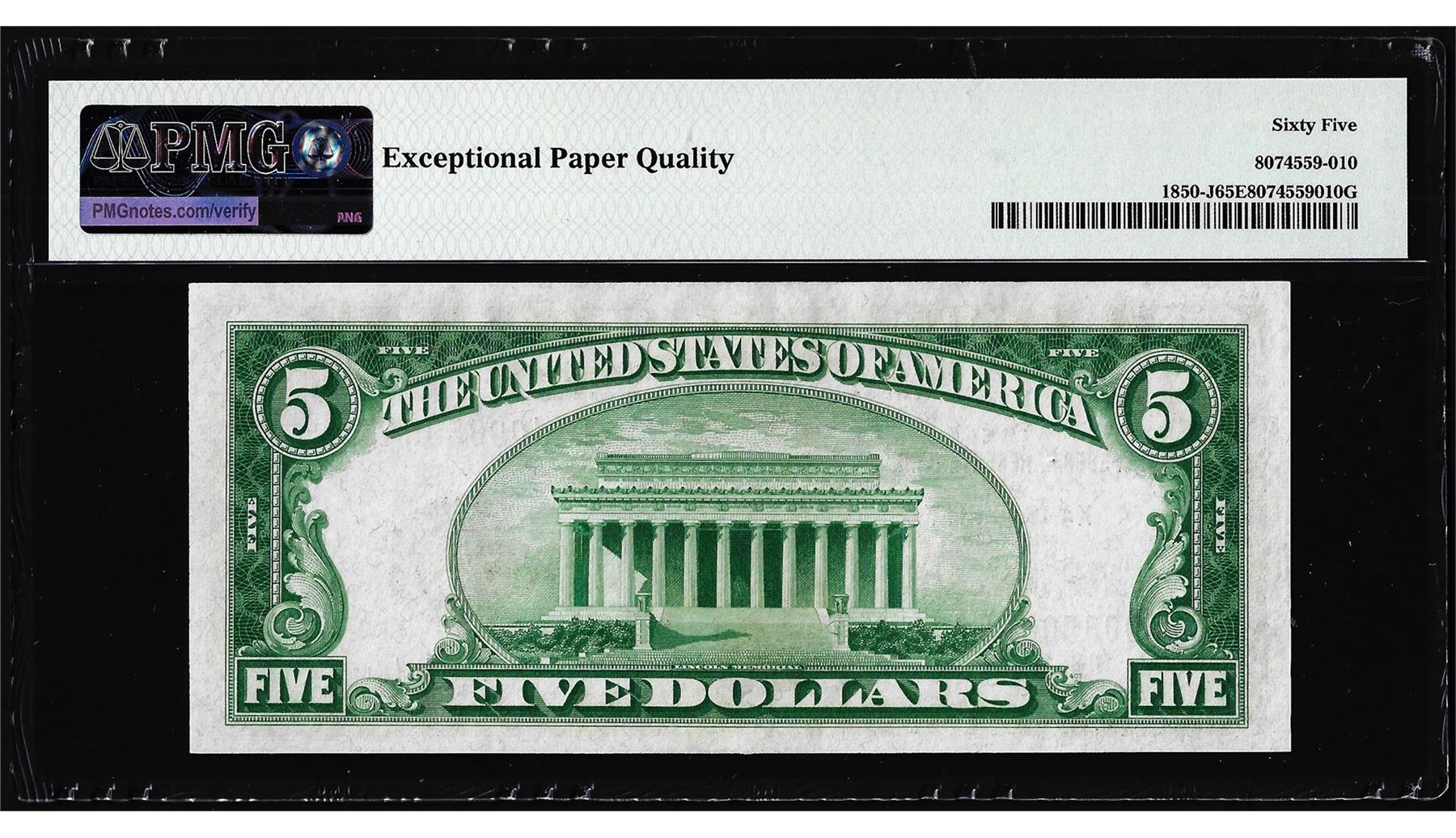 1929 $5 Federal Reserve Bank Note Kansas City Fr.1850-J PMG Gem Uncirculated 65EPQ