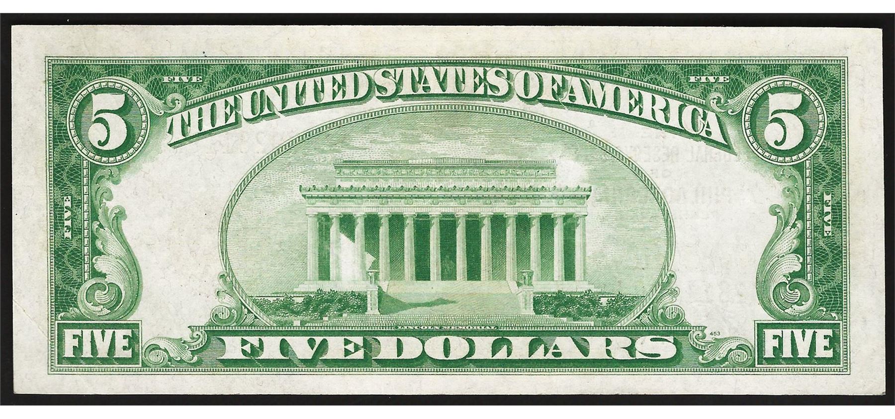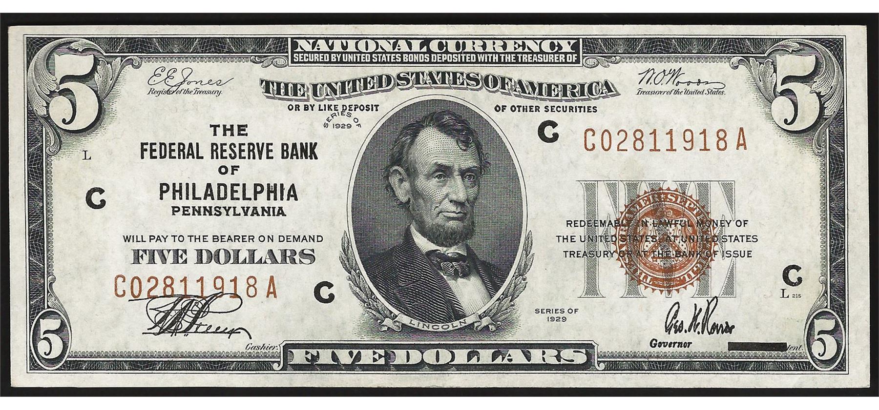 One 1929 $5 Federal Reserve Bank Note Philadelphia.