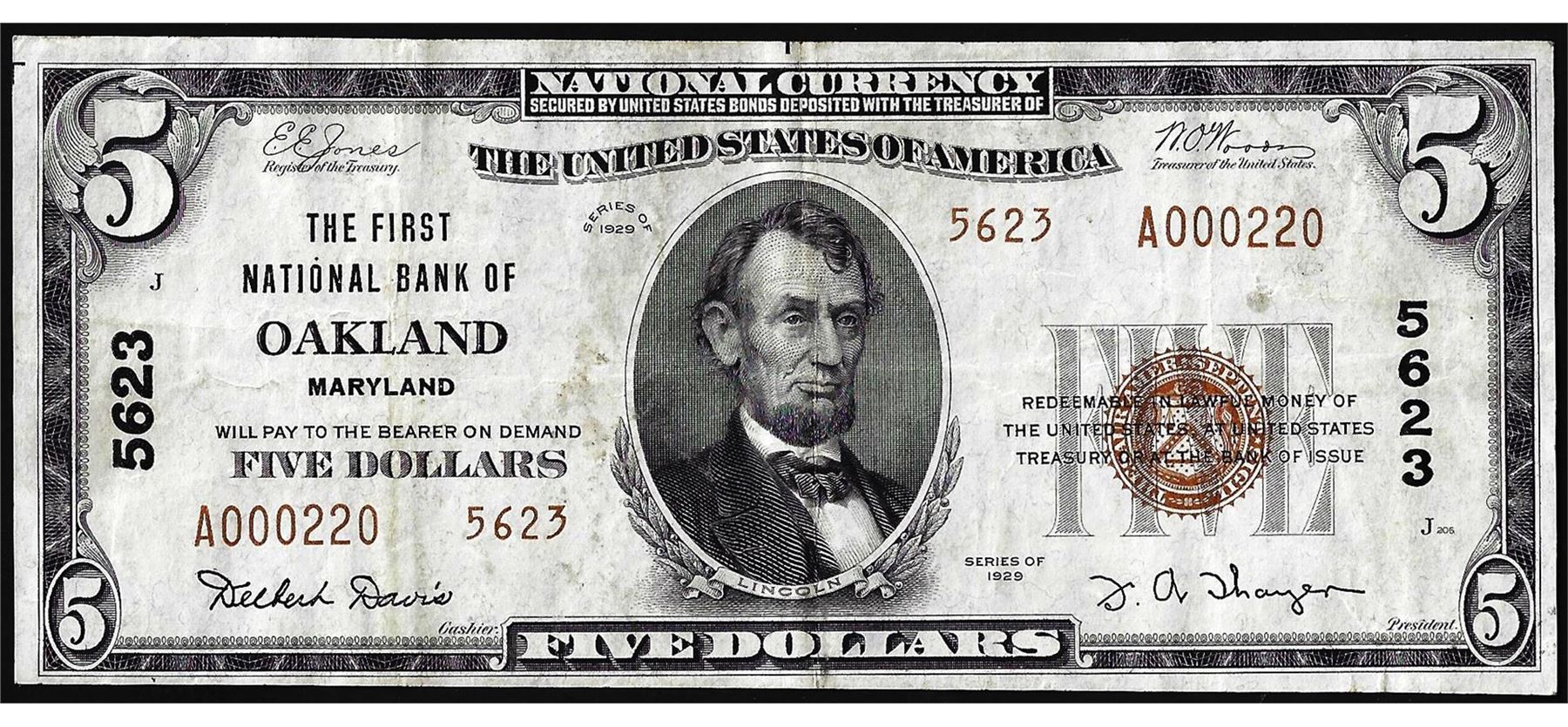 1929 $5 First NB in Oakland, MD CH# 5623 National Currency Note Low Serial Number