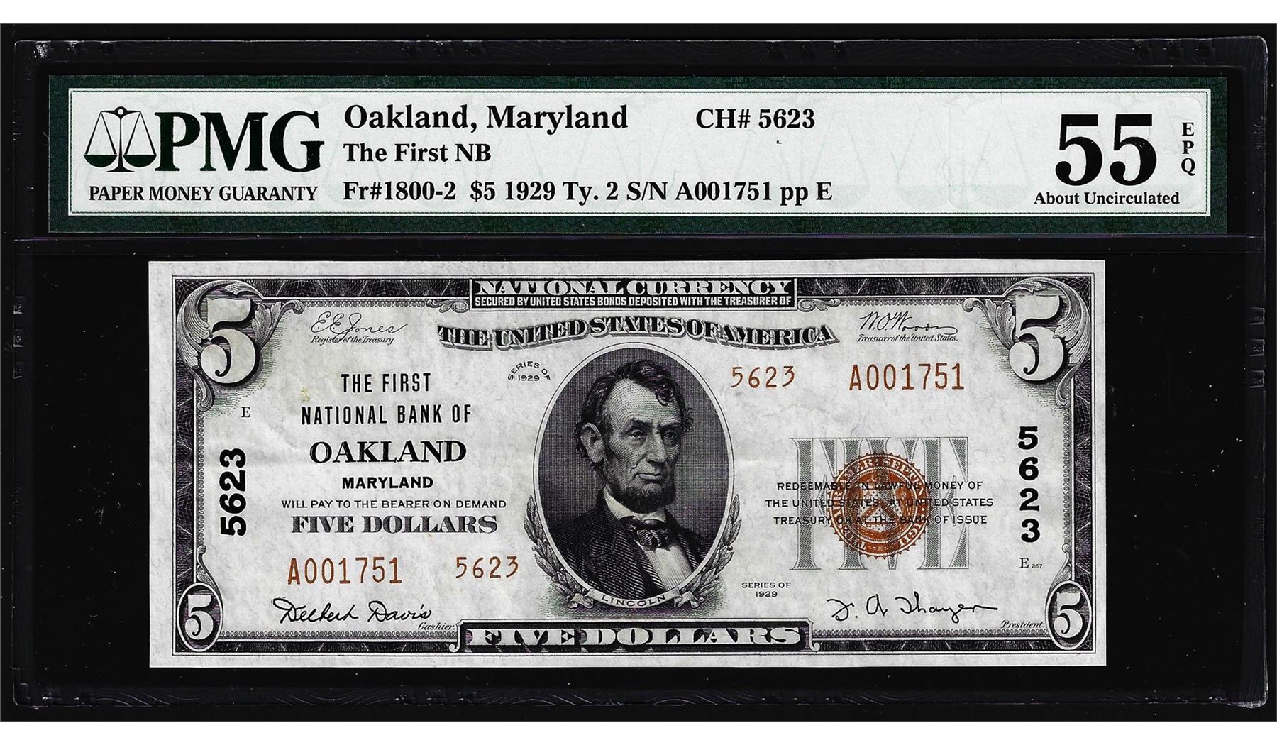 One 1929 $5 First NB of Oakland, MD CH# 5623 National Note PMG About Uncirculated 55EPQ. PMG Certified.