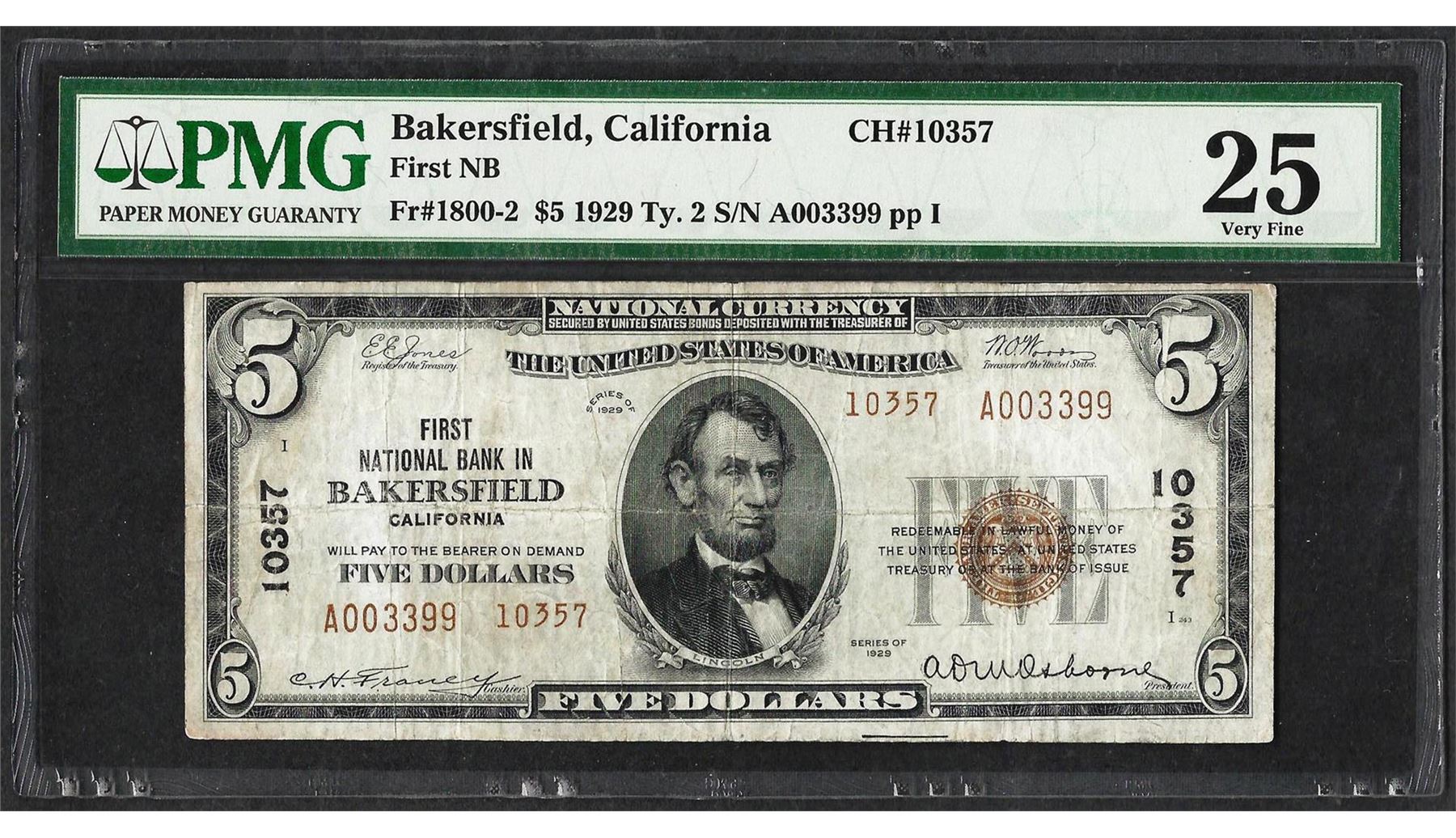 One 1929 $5 First National Bank in Bakersfield, CA Note CH#10357 PMG Very Fine 25. PMG Certified.