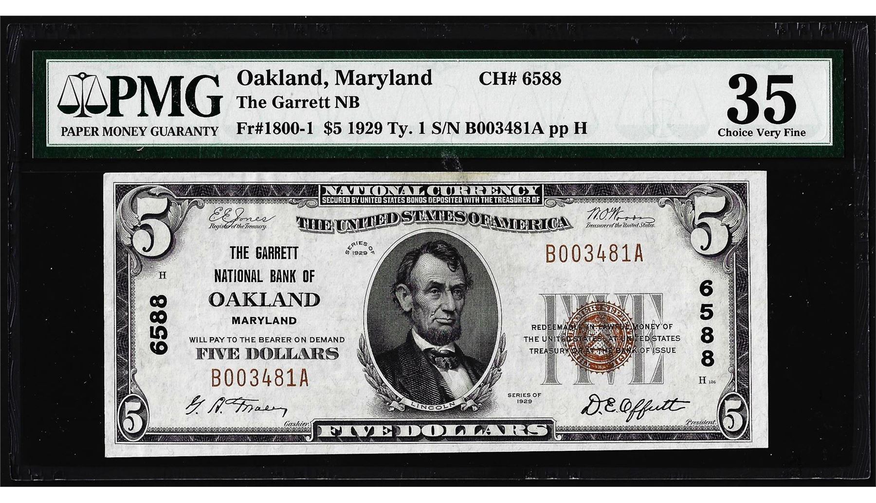 One 1929 $5 Garrett NB of Oakland, MD CH# 6588 National Currency Note PMG Choice Very Fine 35. PMG Certified.