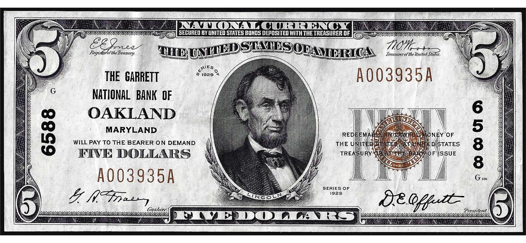 One 1929 $5 Garrett NB of Oakland, Maryland CH# 6588 National Currency Note.