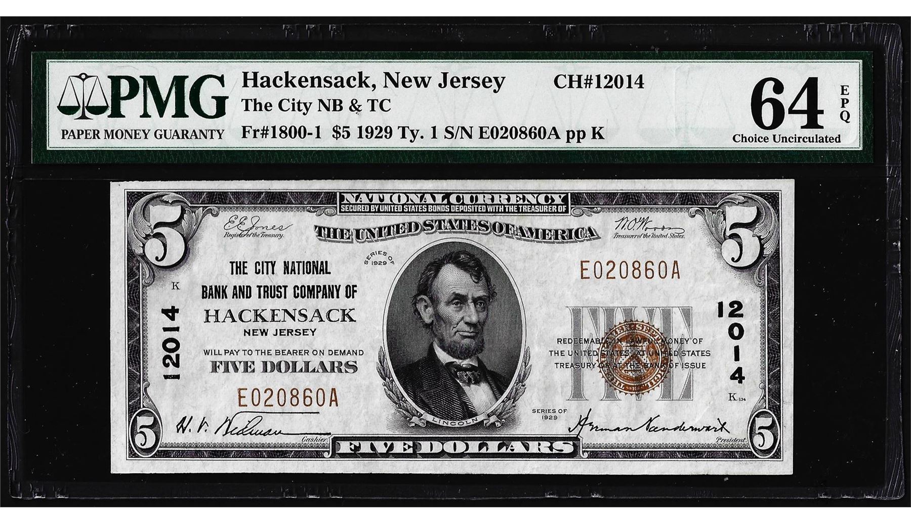 One 1929 $5 Hackensack, NJ CH# 12014 National Currency Note PMG Choice Uncirculated 64EPQ. PMG Certified.