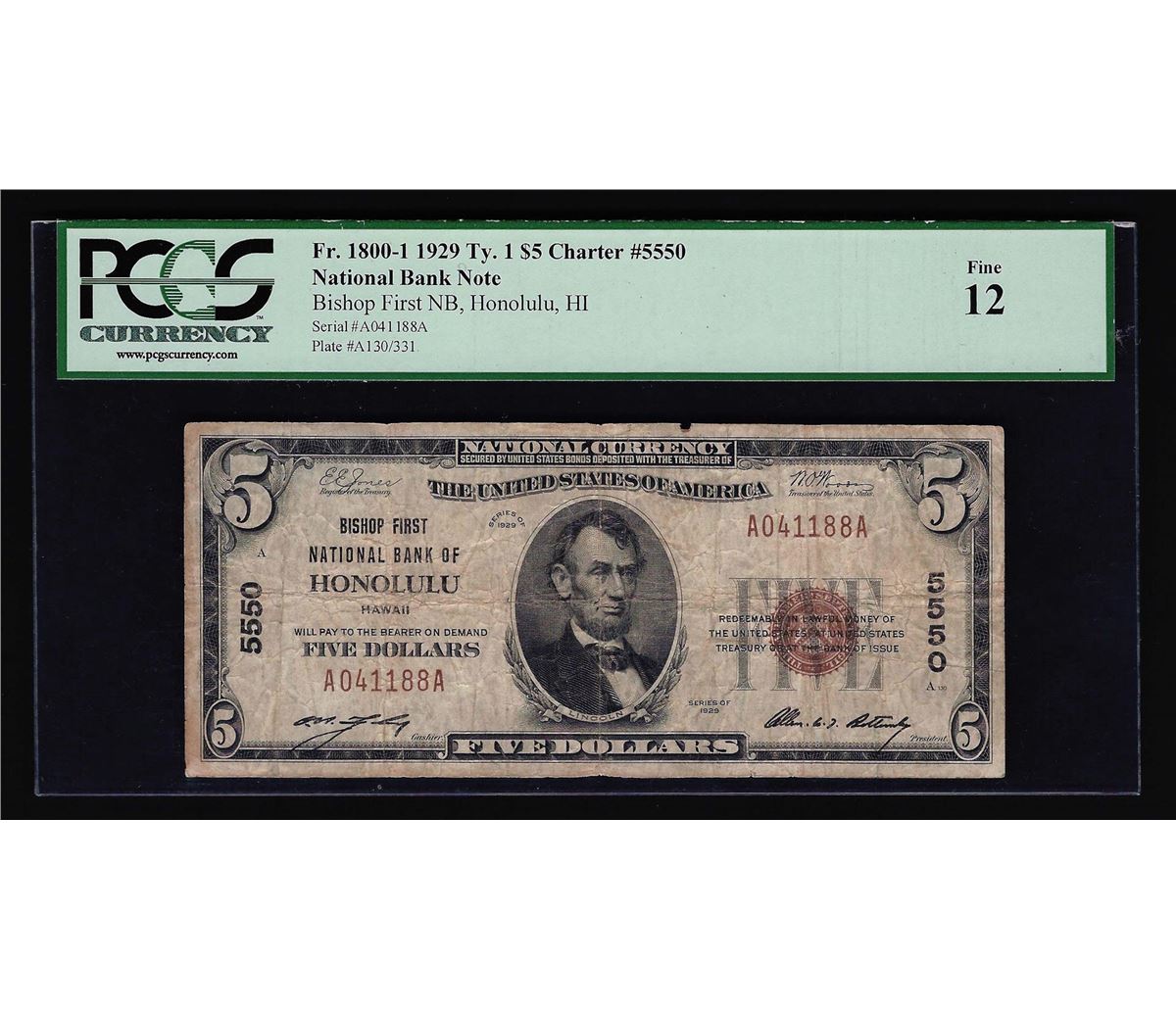 One 1929 $5 Honolulu Hawaii National Bank Note PCGS F12. PCGS Graded.