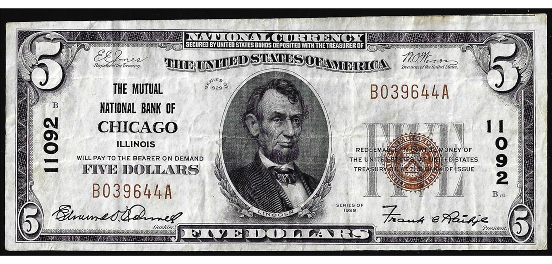 One 1929 $5 Mutual NB of Chicago, IL CH# 11092 National Currency Note.