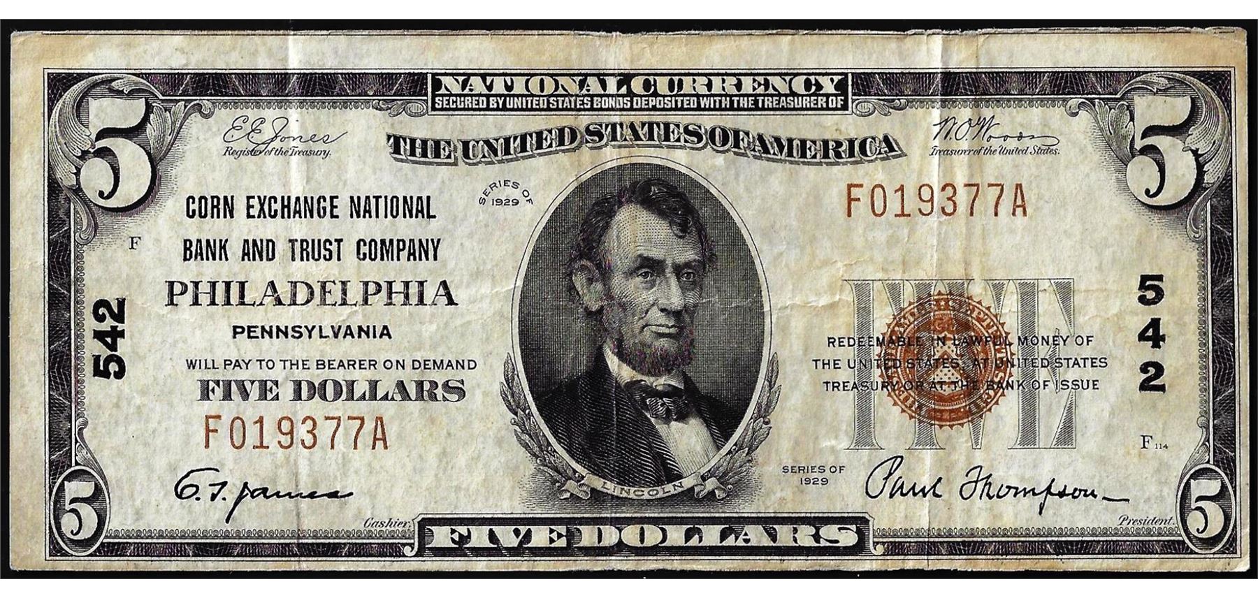 1929 $5 NB and Trust Company of Philadelphia, PA CH#542 National Currency Note