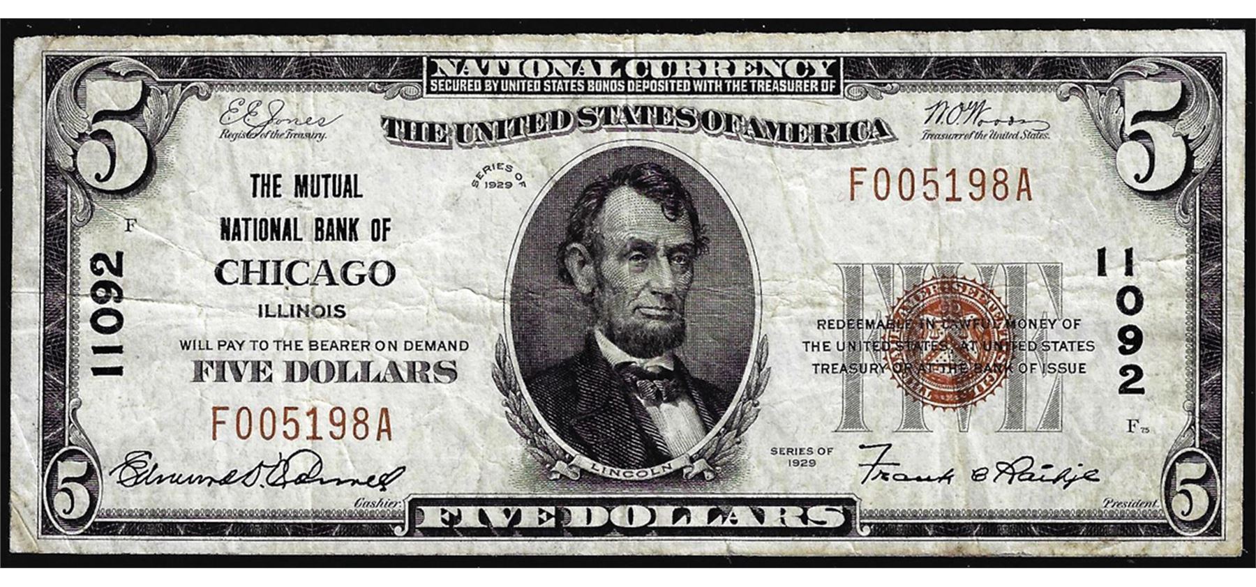One 1929 $5 NB of Chicago, IL CH# 11092 National Currency Note.