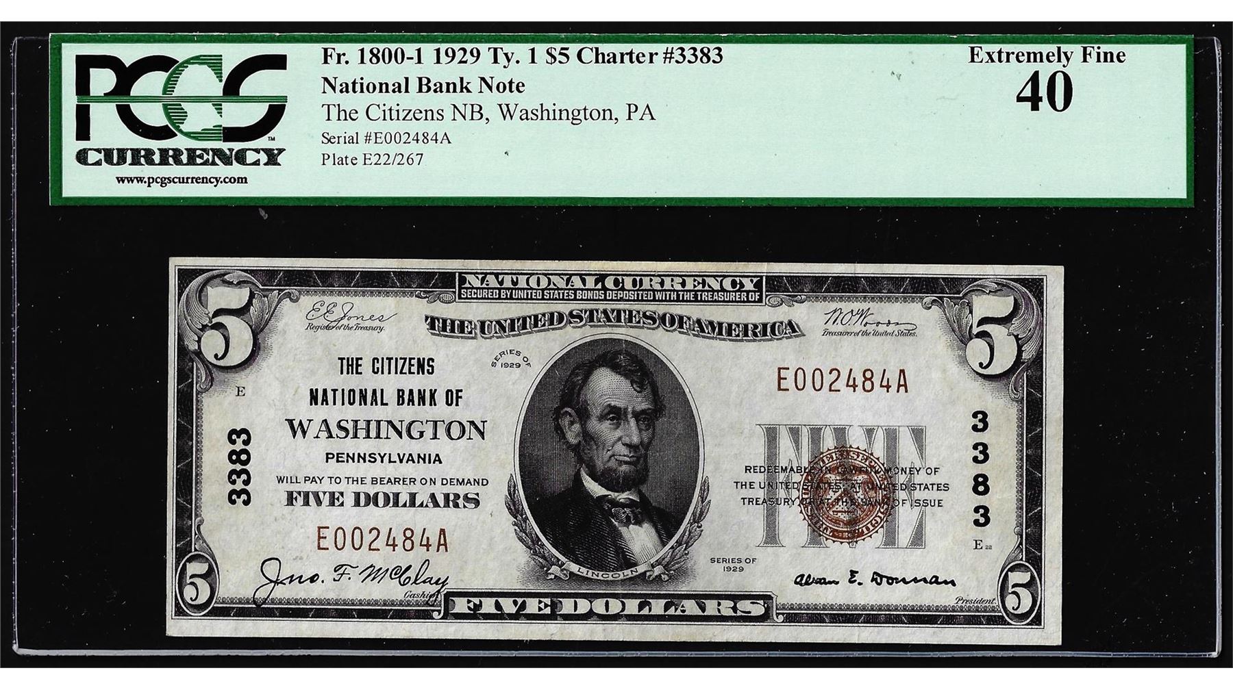 One 1929 $5 NB of Washington, PA CH# 3383 National Currency Note PCGS Extremely Fine 40. PCGS Graded.