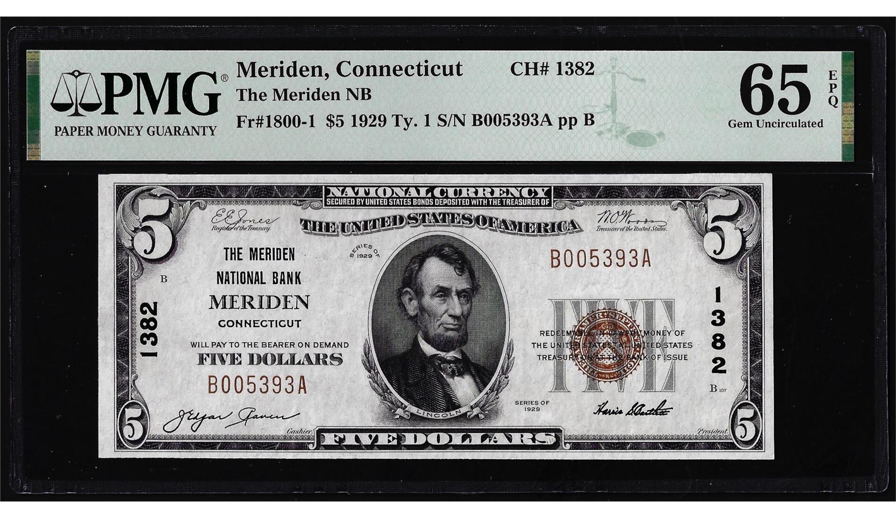 One 1929 $5 National Bank Meriden, CT CH# 1382 National Note PMG Gem Uncirculated 65EPQ. PMG Certified.