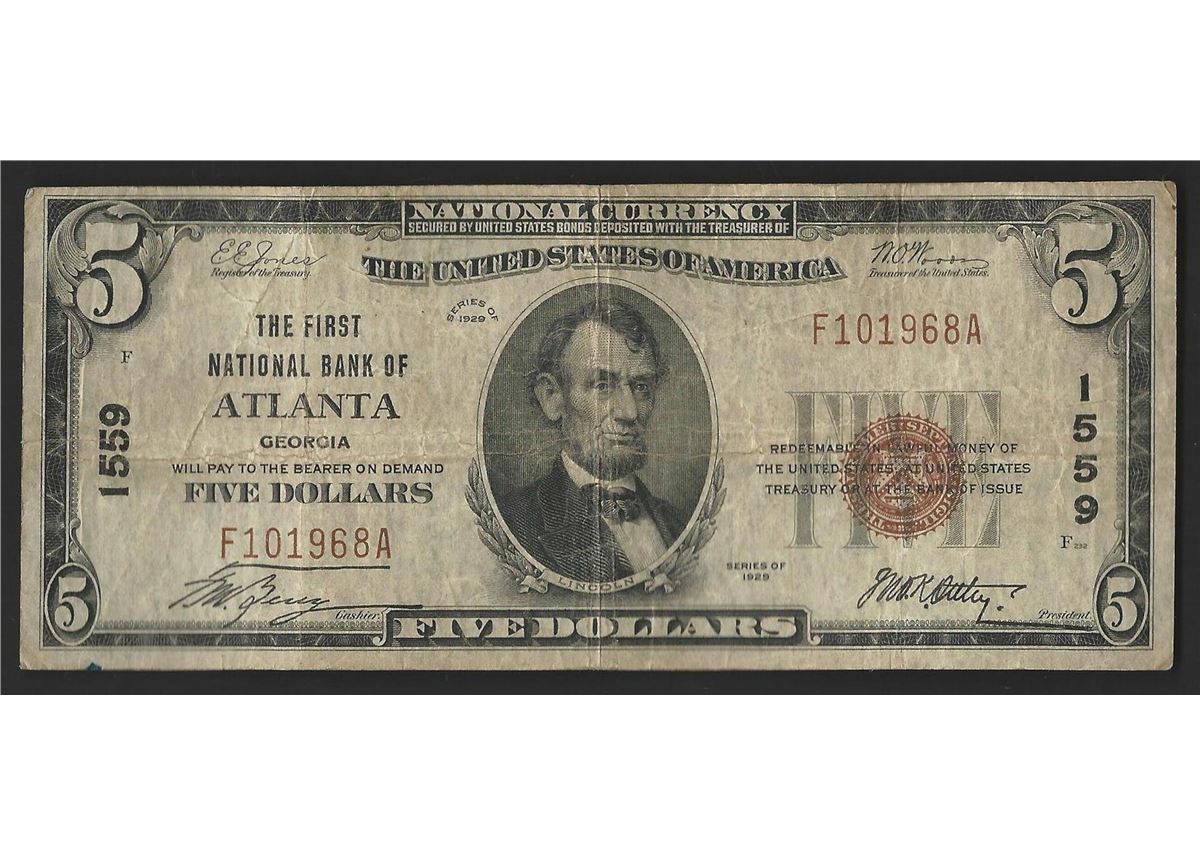 1929 $5 National Bank Note of Atlanta Georgia Charter #1559