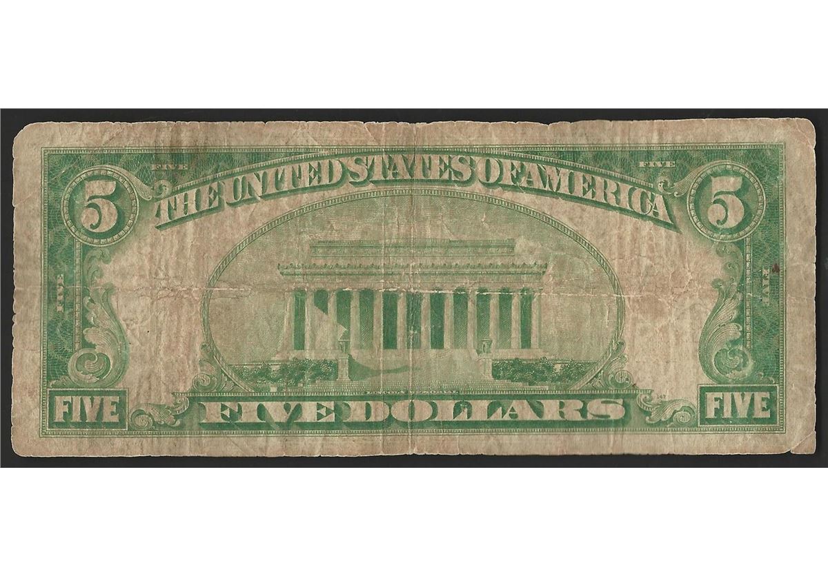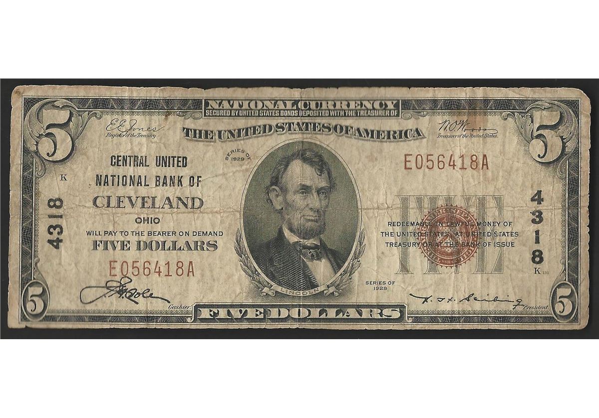 One 1929 $5 National Bank Note of Cleveland Ohio Charter #4318.