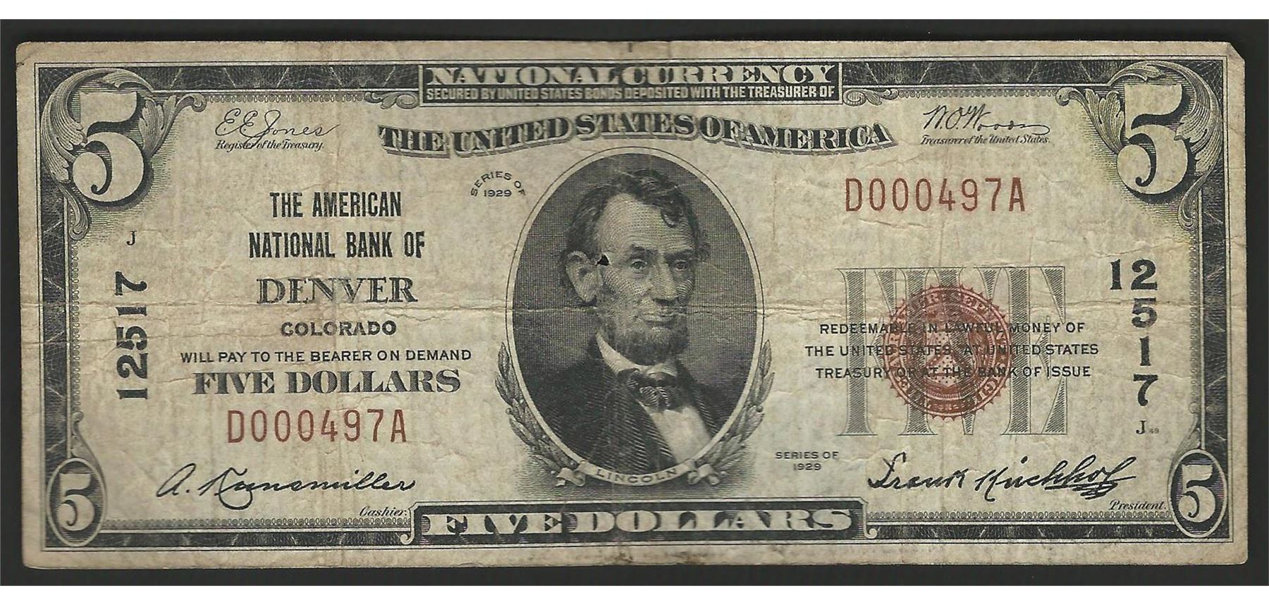 1929 $5 National Bank Note of Denver Colorado Charter #12517
