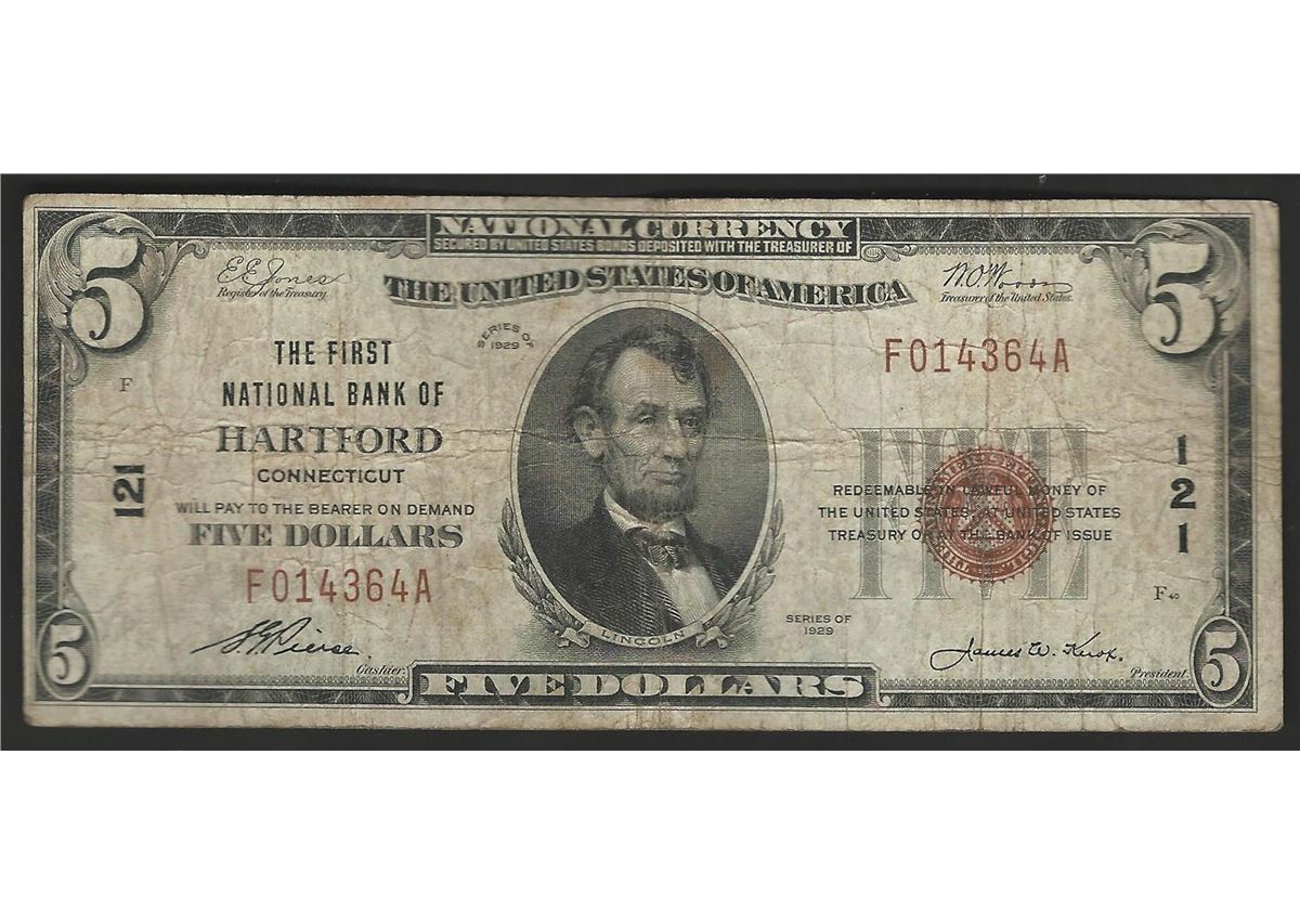 1929 $5 National Bank Note of Hartford Connecticut Charter #121
