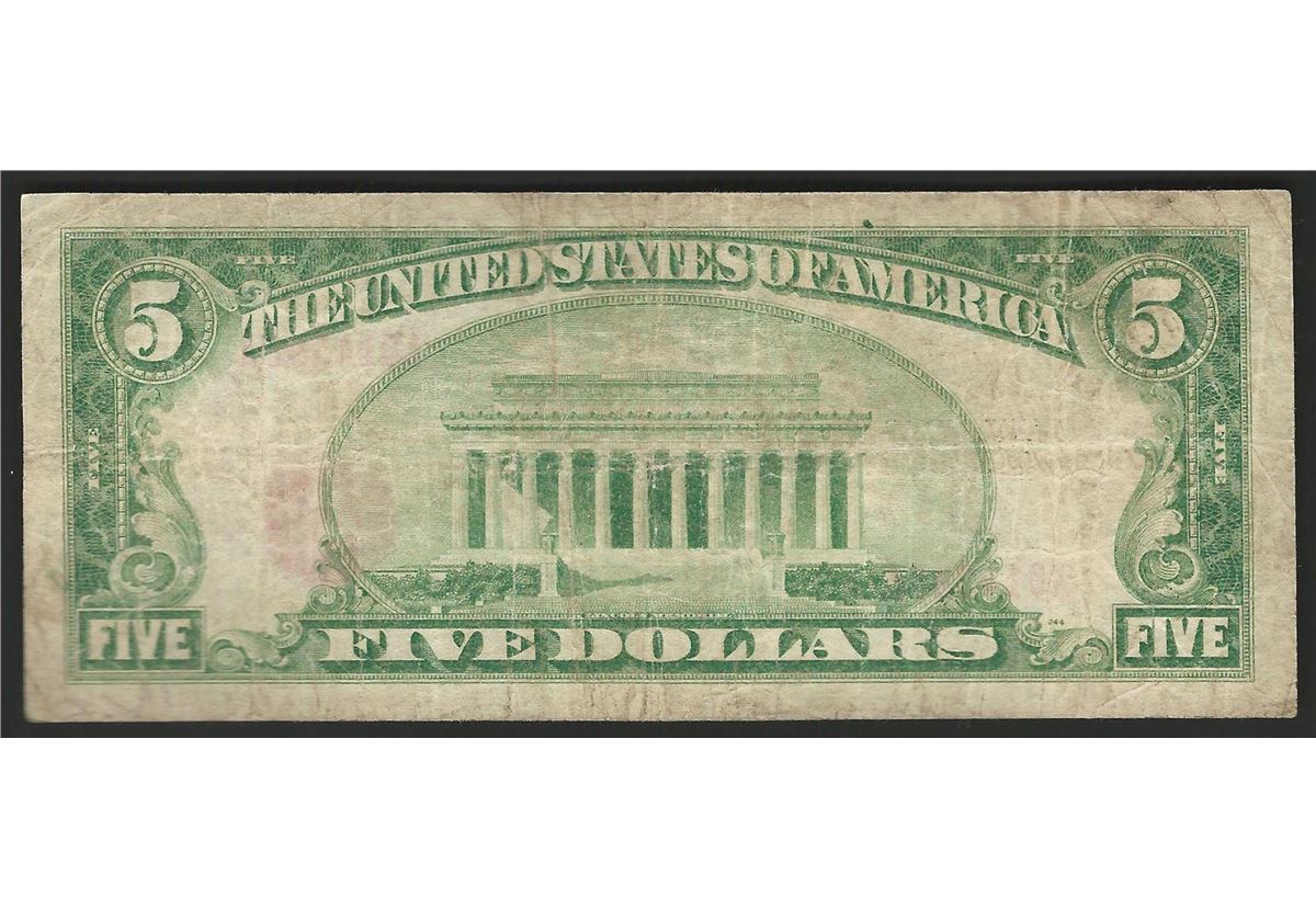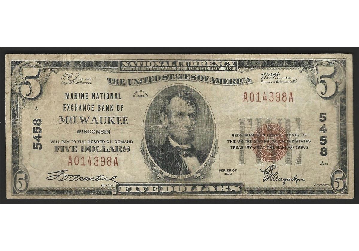 One 1929 $5 National Bank Note of Milwaukee Wisconsin Charter #5458.