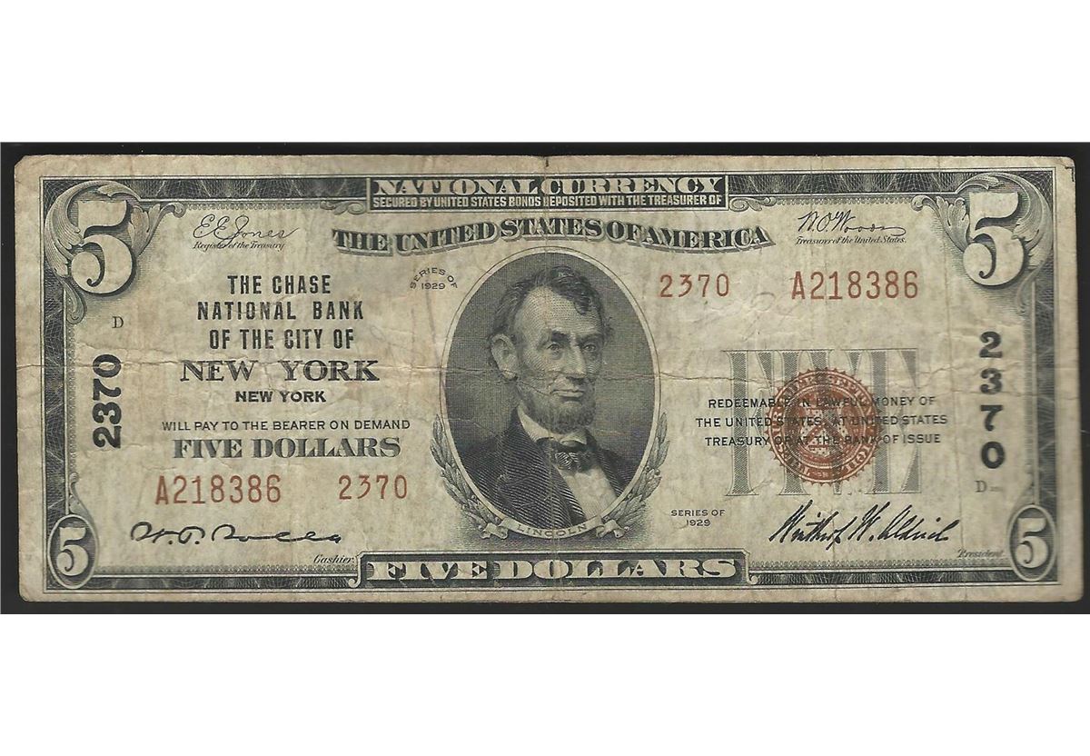 1929 $5 National Bank Note of New York New York Charter #2370