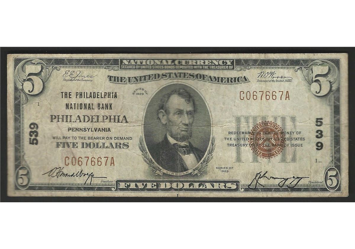 One 1929 $5 National Bank Note of Philadelphia Pennsylvania Charter #539.