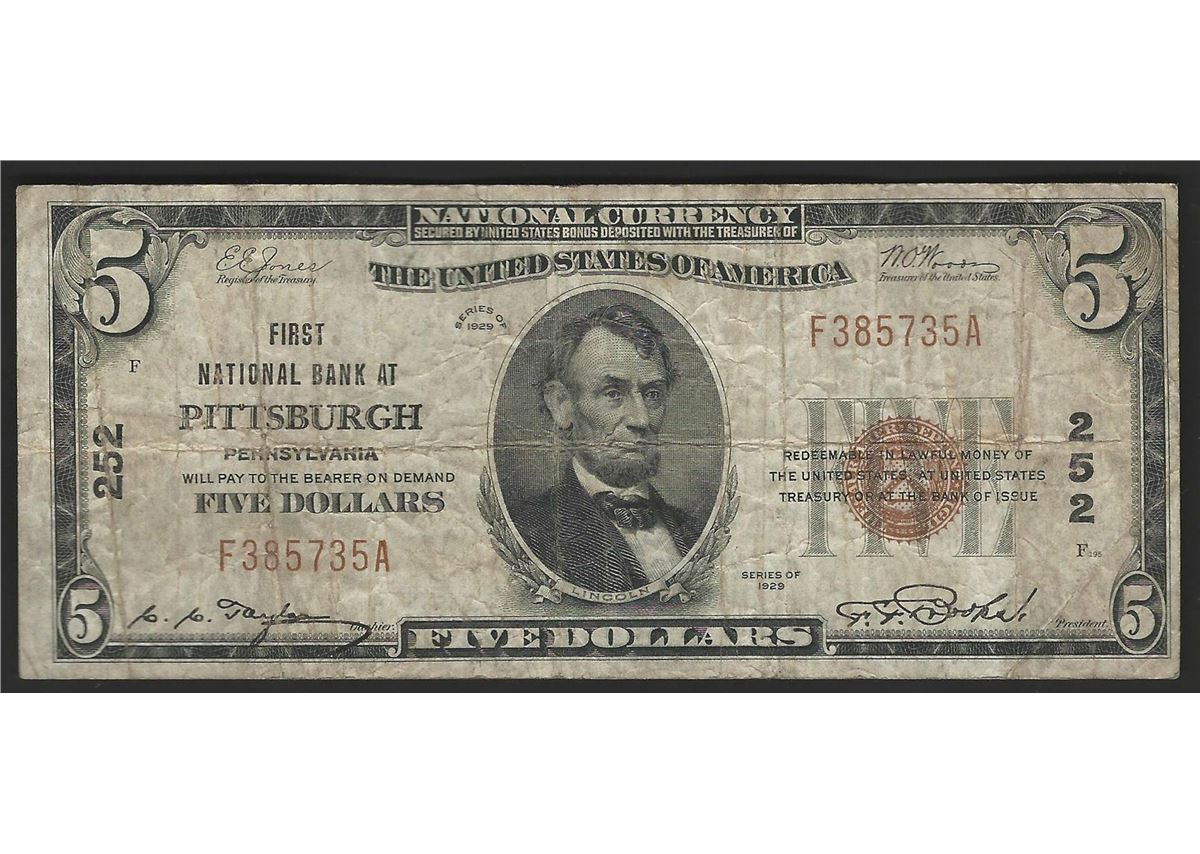 1929 $5 National Bank Note of Pittsburgh Pennsylvania Charter #252