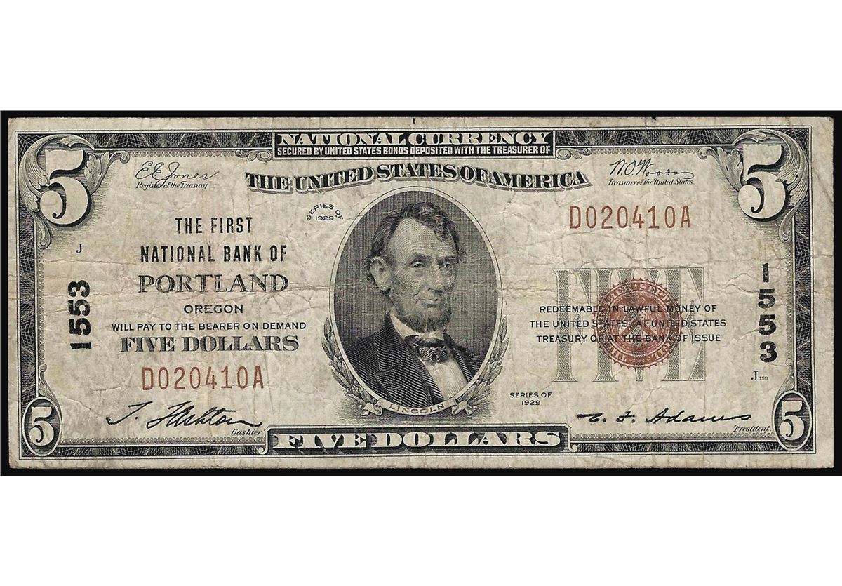 One 1929 $5 National Bank of Portland, OR National Currency Note.