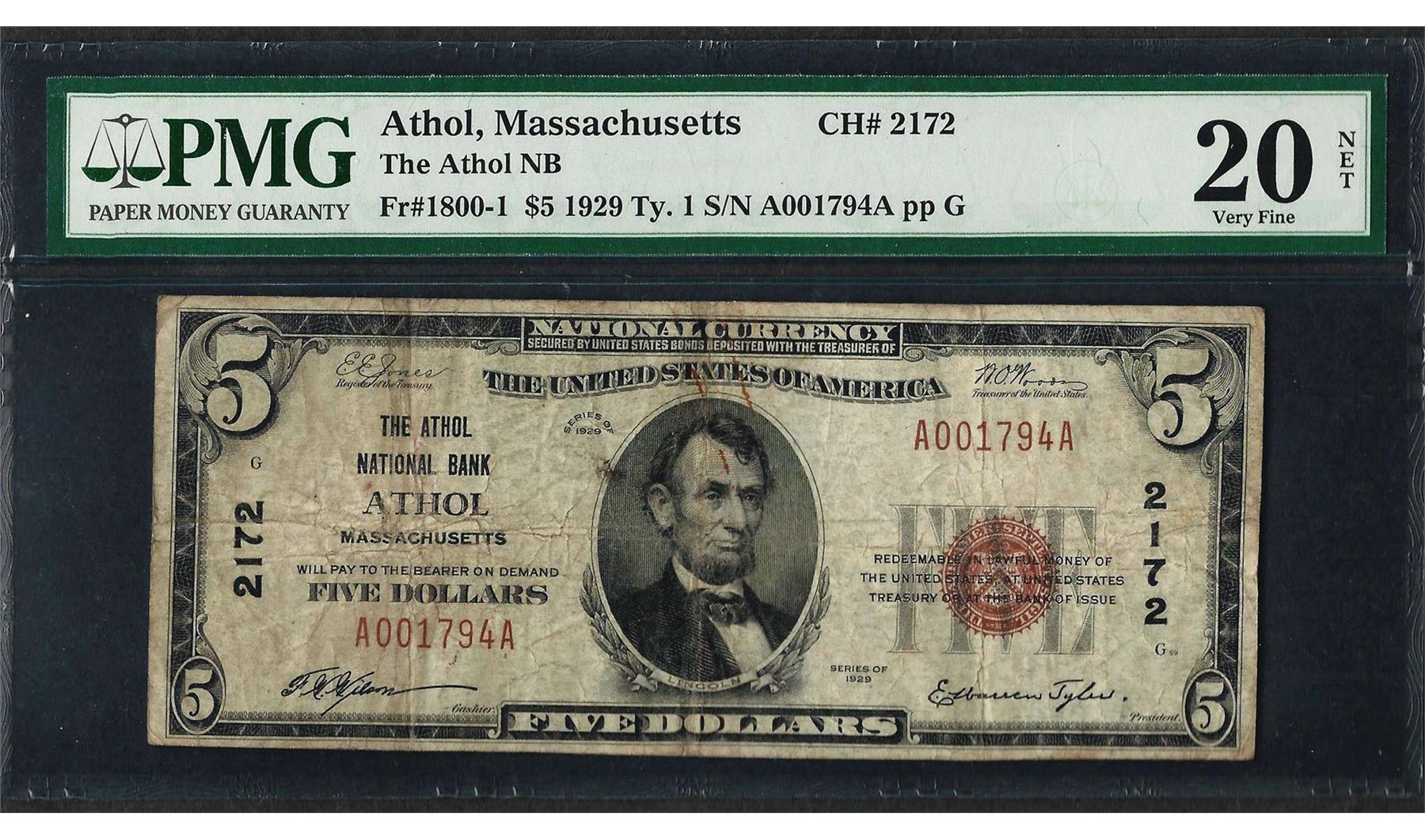 One 1929 $5 National Currency Note Athol, MA CH# 2172 PMG Very Fine 20 Net. PMG Certified.
