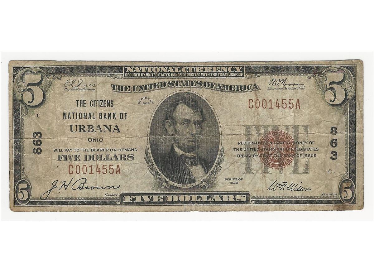 One 1929 $5 National Currency The Citizens Bank of Urbana Note.