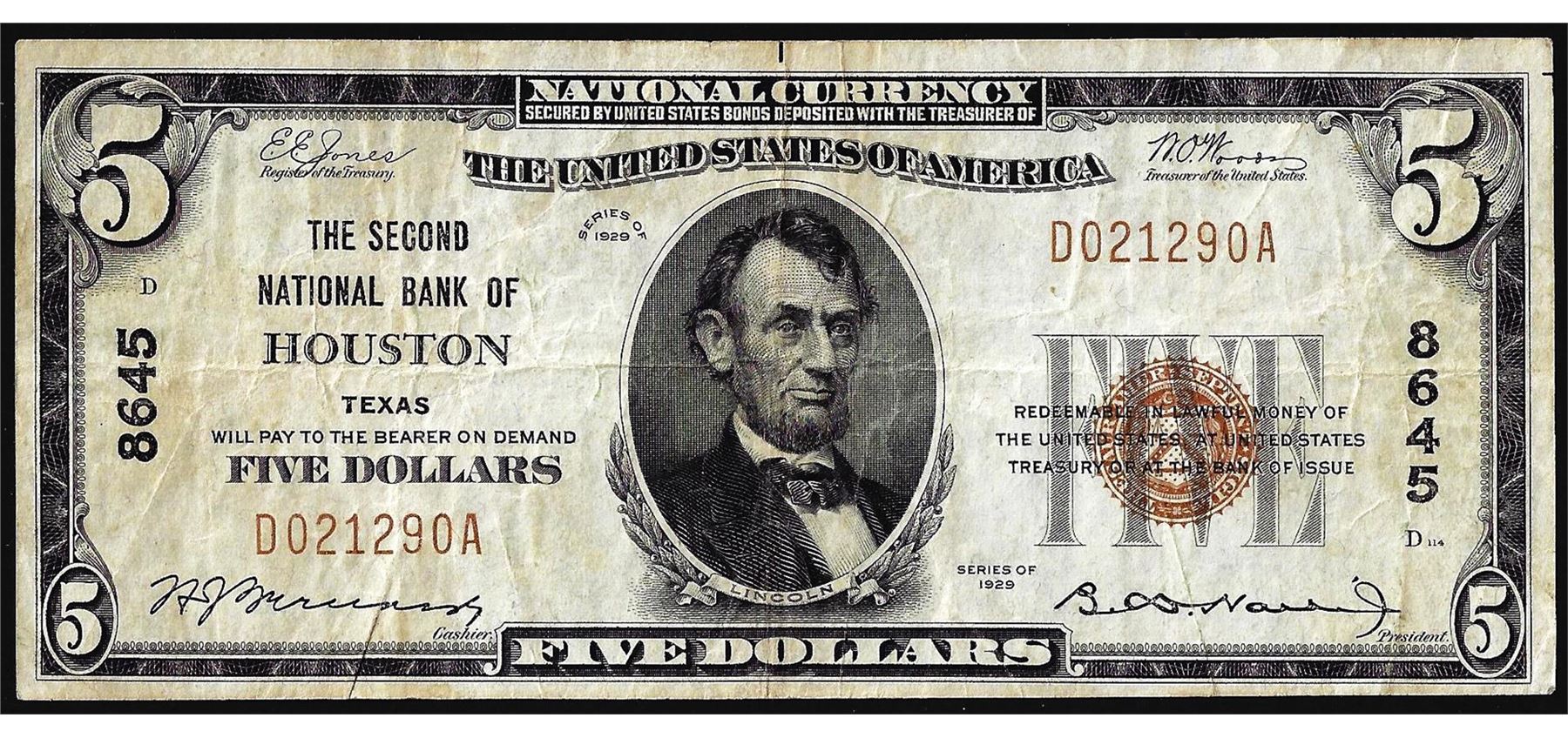 One 1929 $5 Second National Bank of Houston, Texas CH# 8645 National Currency Note.