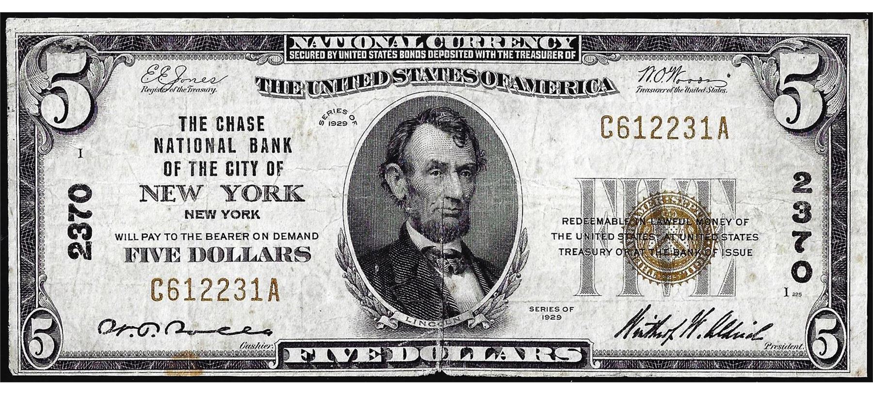 One 1929 $5 The Chase National Bank of New York, NY CH# 2370 National Currency Note.