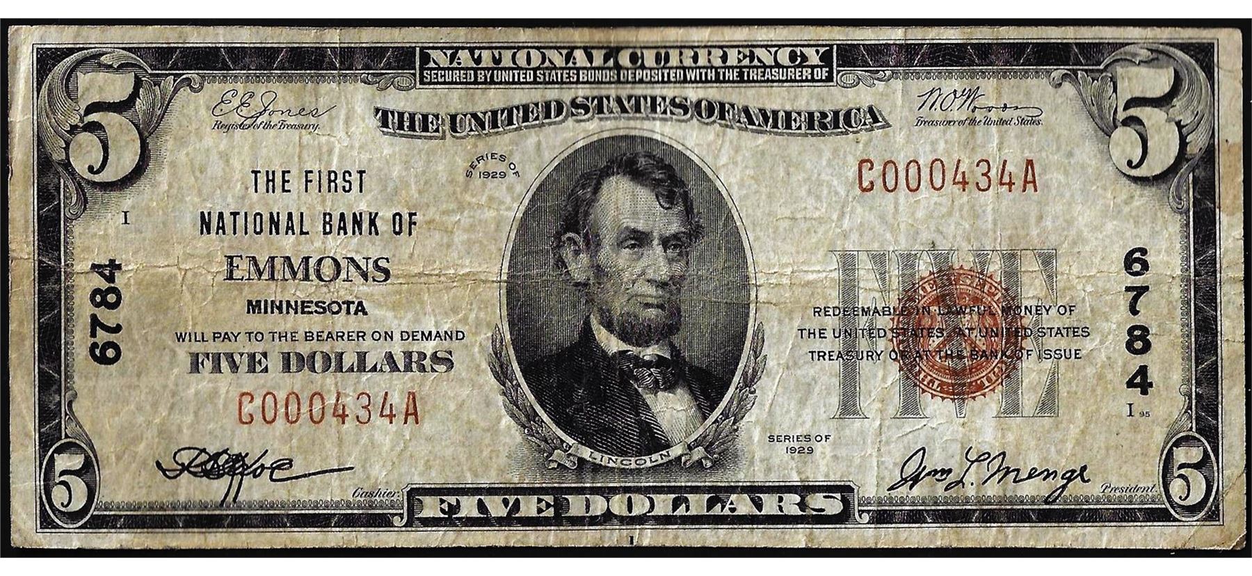 One 1929 $5 The First National Bank of Emmons, MN CH# 6784 National Currency Note.