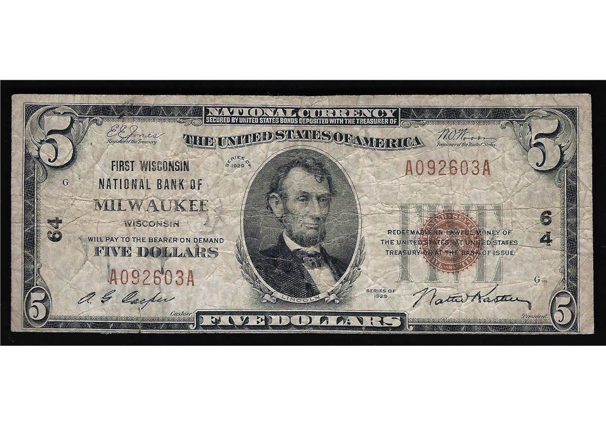 One 1929 $5 The First Wisconsin National Bank of Milwaukee National Currency Note.