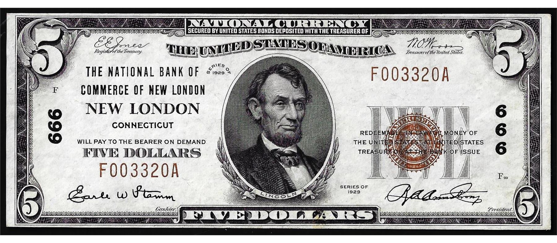 One 1929 $5 The National Bank of Commerce New London, CT CH# 666 National Currency Note.
