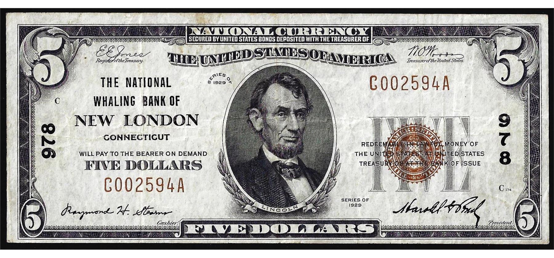 1929 $5 The National Whaling Bank of New London, CT CH# 978 National Currency Note