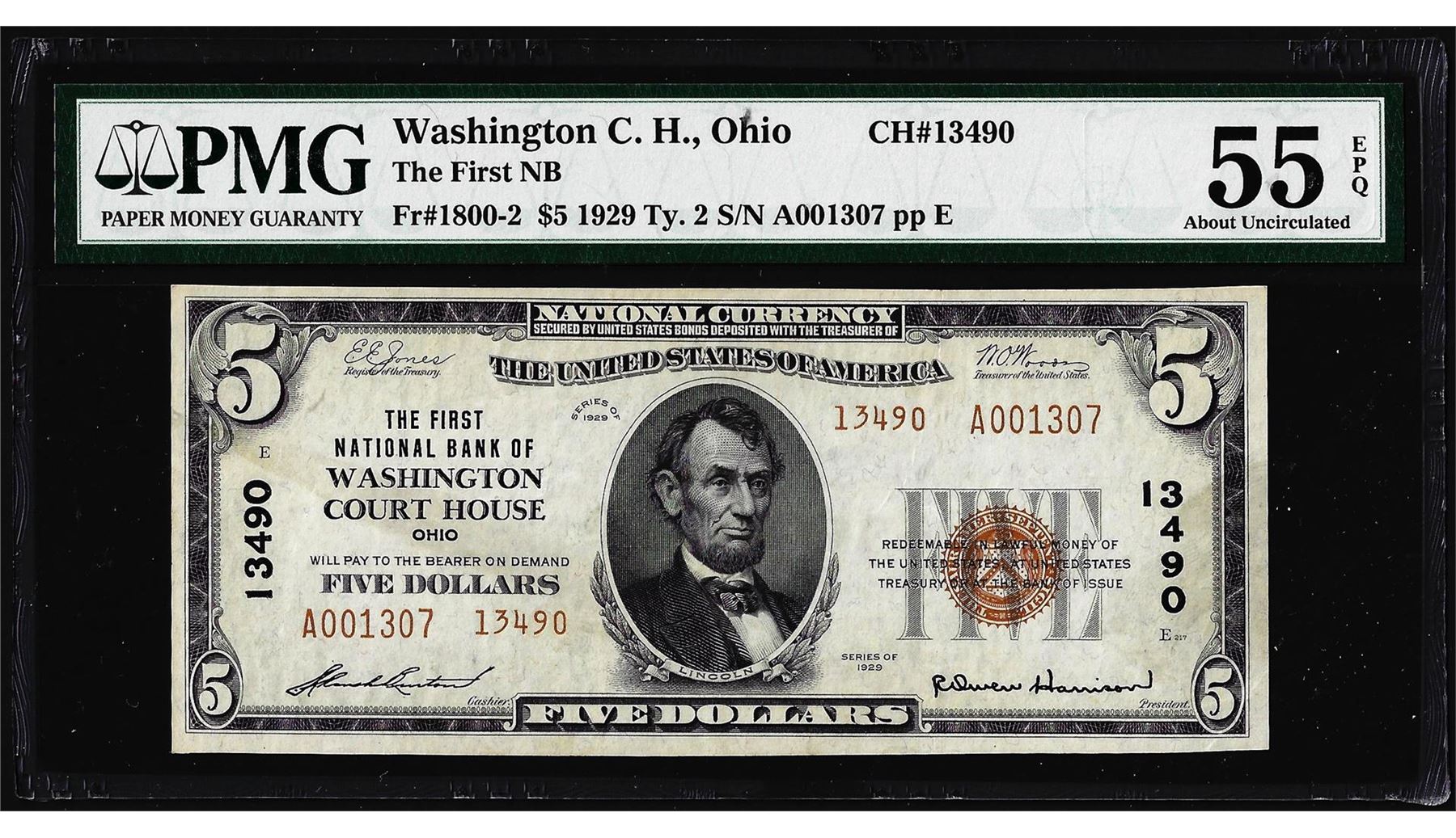One 1929 $5 Washington Court House, OH CH# 13490 National Note PMG About Uncirculated 55EPQ. PMG Certified.