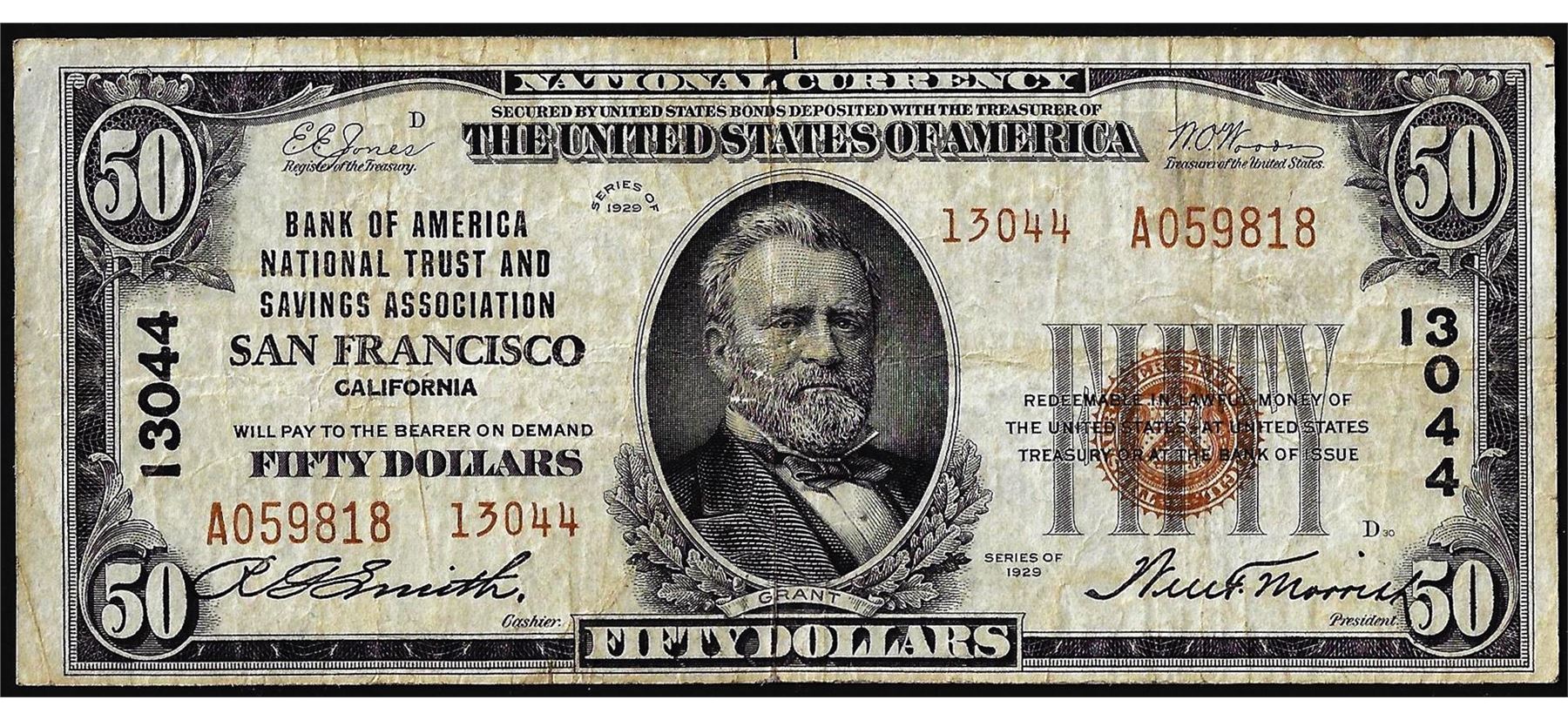 One 1929 $50 BofA Trust & Savings San Francisco, CA CH# 13044 National Currency Note.