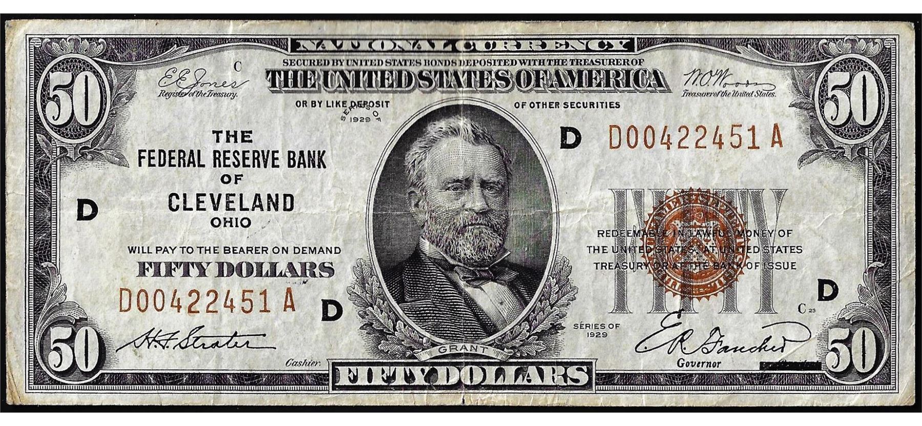 One 1929 $50 Federal Reserve Bank Note Cleveland.