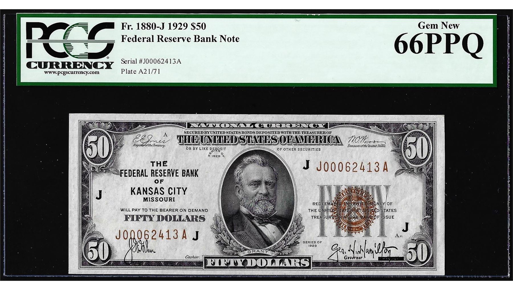 One 1929 $50 Federal Reserve Bank Note Kansas City Fr.1880-J PCGS Gem New 66PPQ. PCGS Graded.